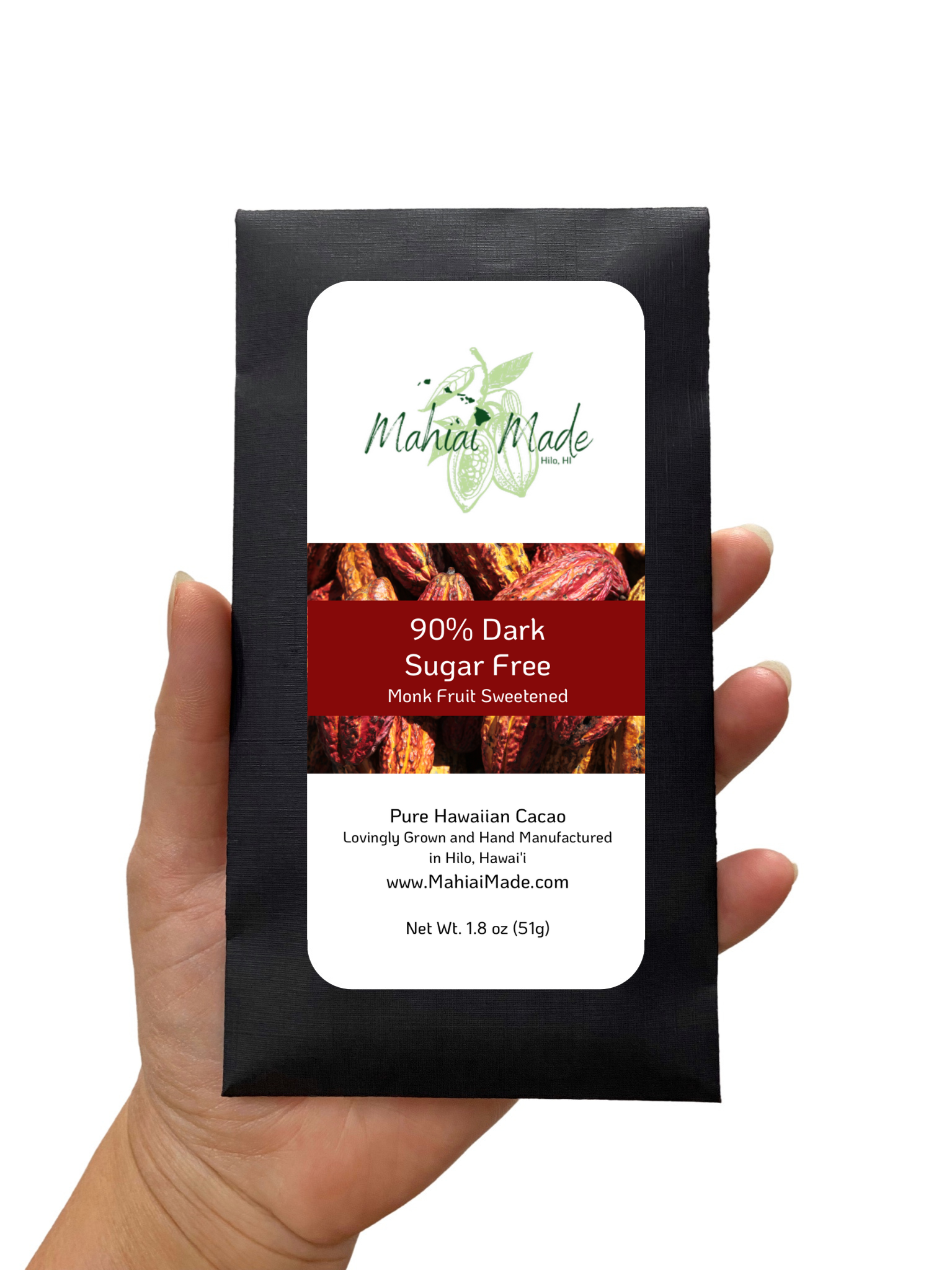 Our 90% Sugar Free Chocolate is deeply dark chocolate, made from only Hawaiian cacao and using a monk fruit sweetener to replace the cane sugar normally used in chocolates.