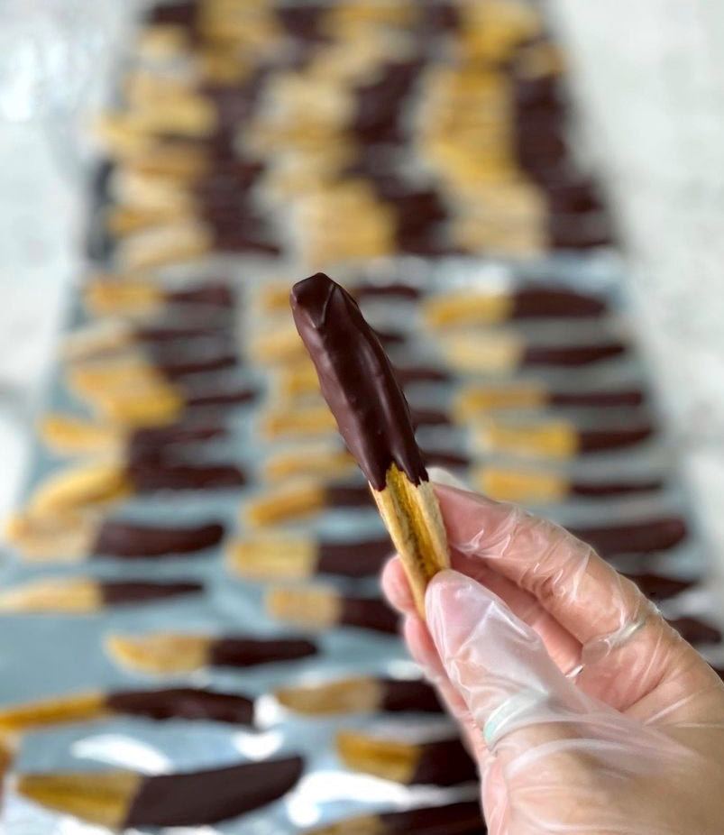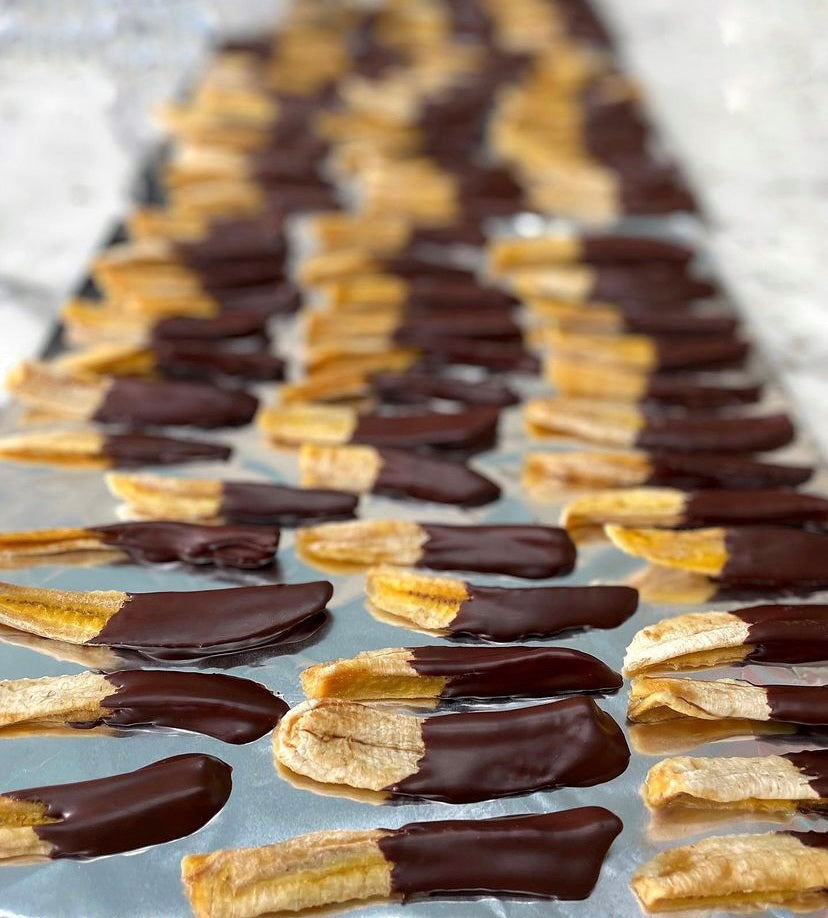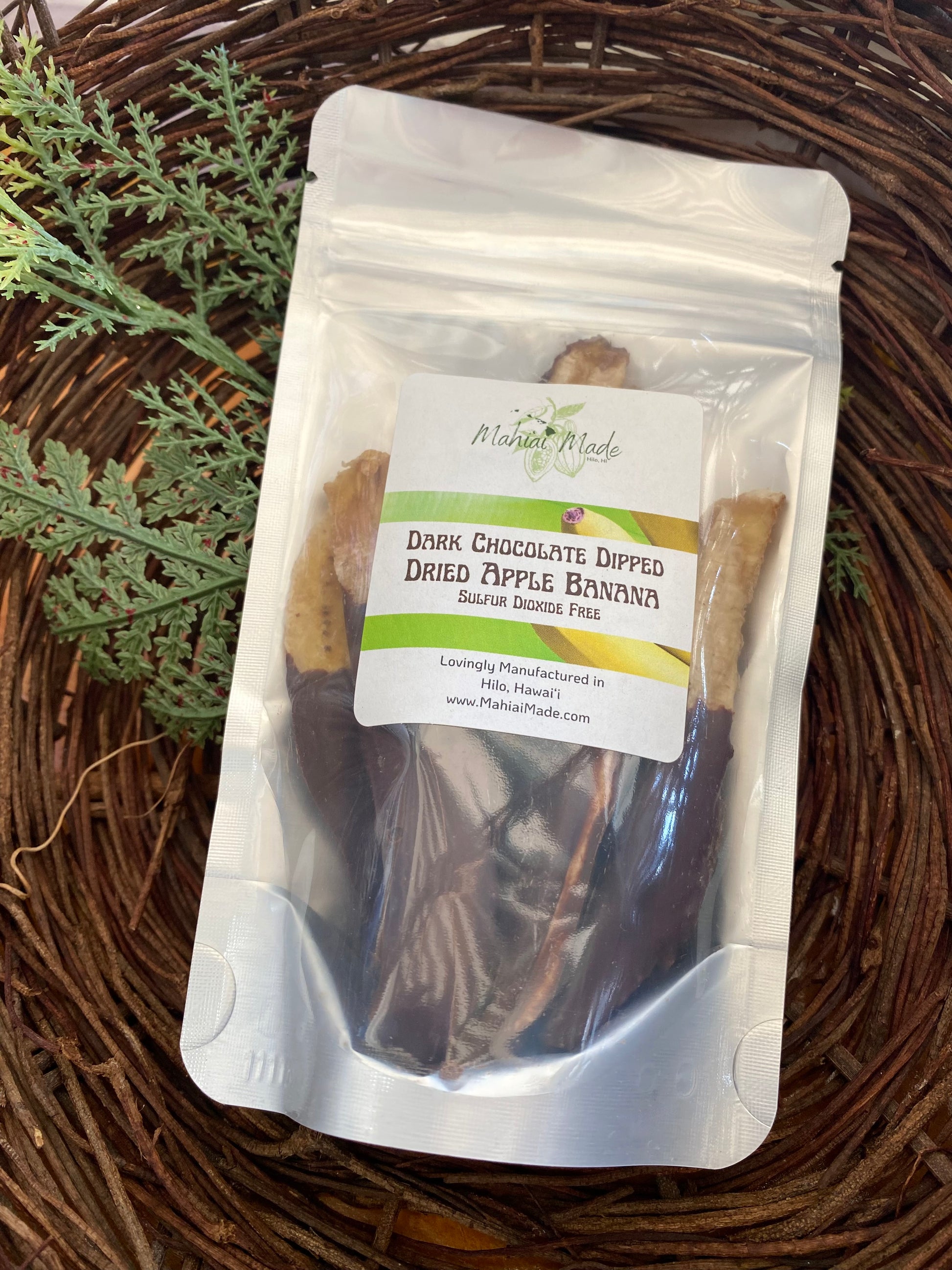 Organic and sulfur dioxide free dried Hawaiian apple banana slices, dipped in or 70% dark chocolate.