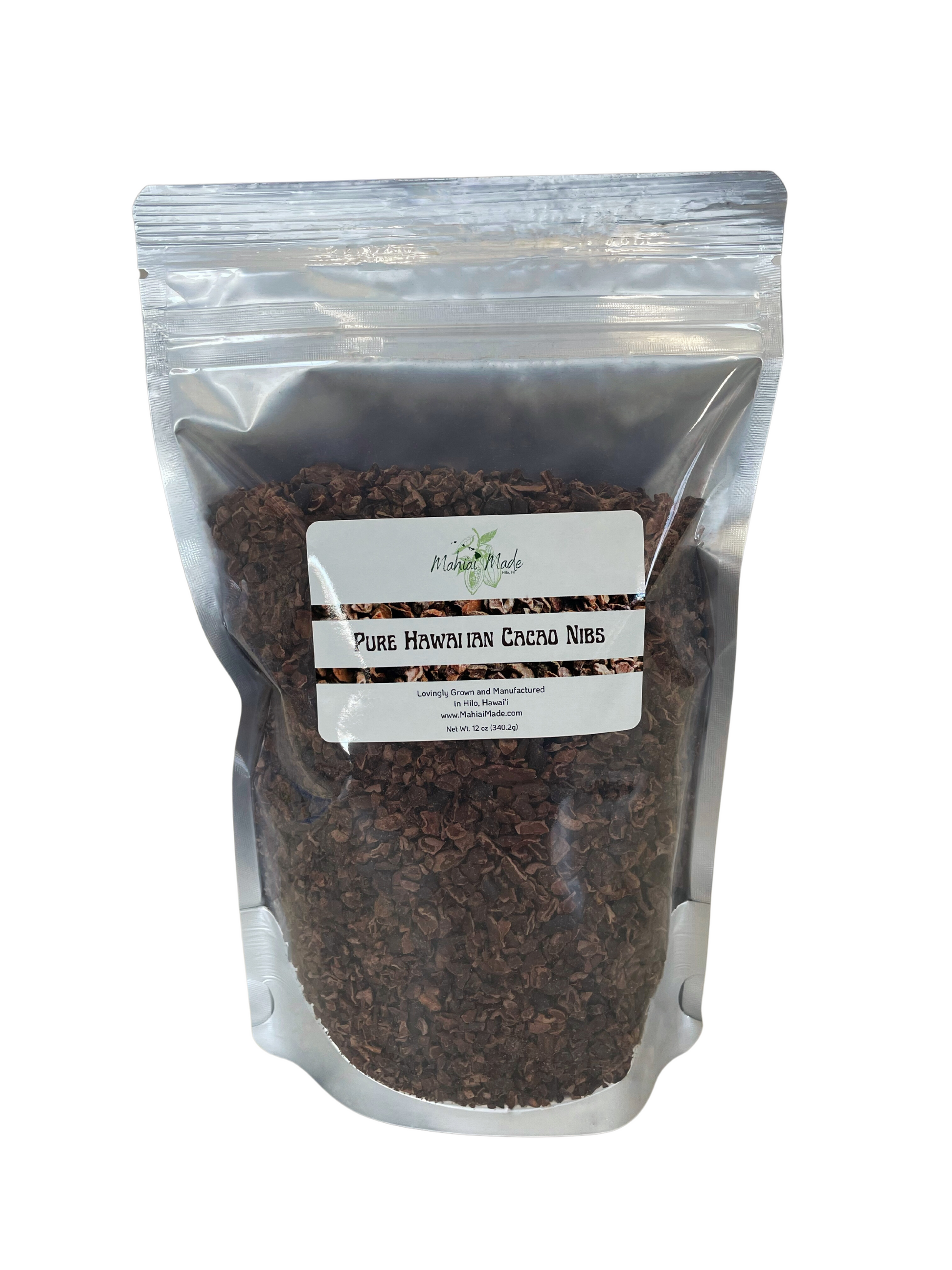 These Hawaiian cacao beans have been roasted and aged to develop their rich natural taste! The whole beans are then winnowed to remove the fibrous outer shells and cracked into ready to use nibs. Consume as is, or add to your creative home recipes.